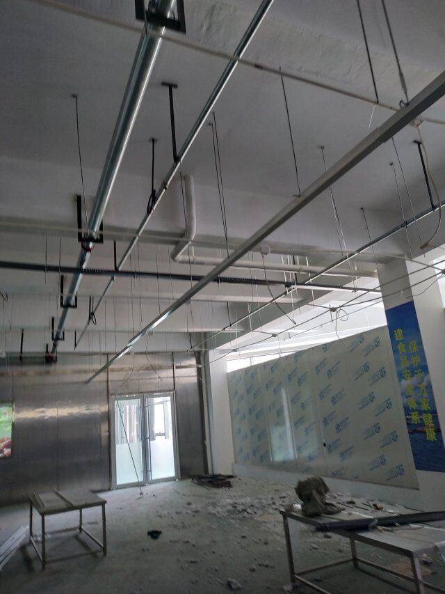 青島盛客隆食品有限公司廠房裝修現場,吊頂施工中