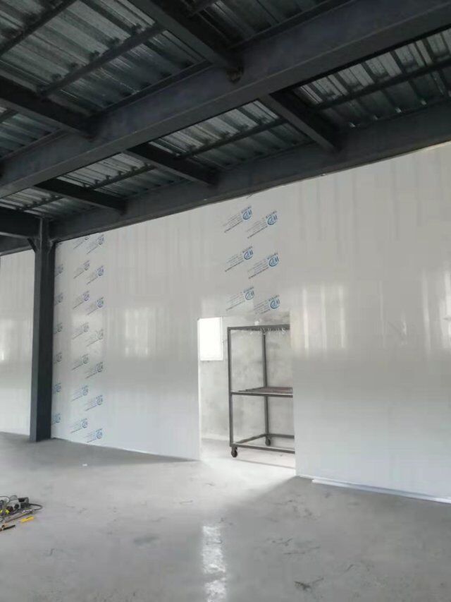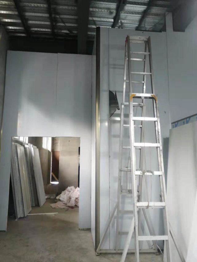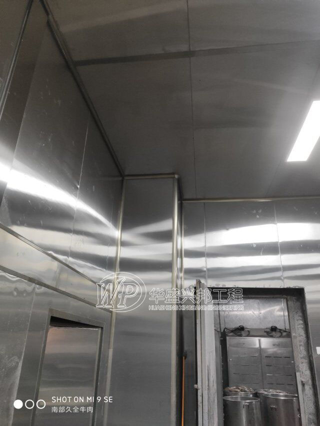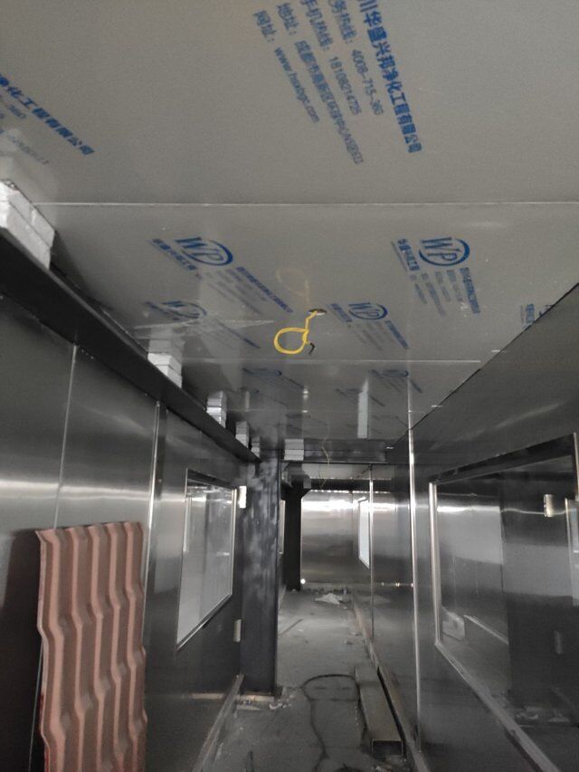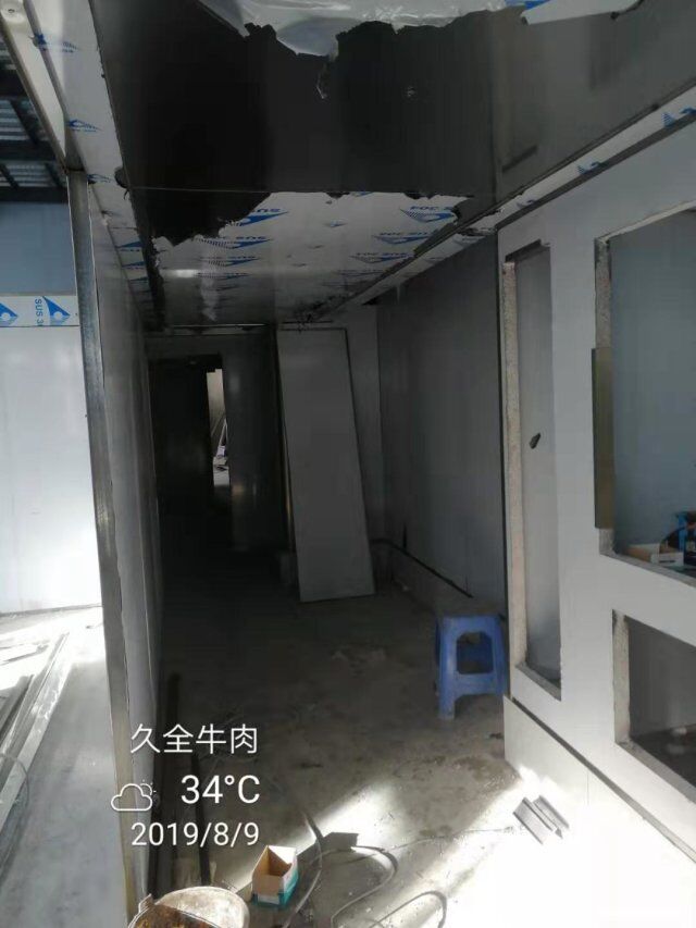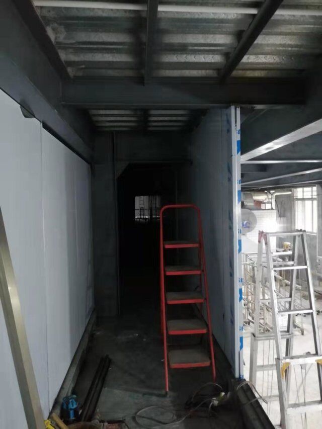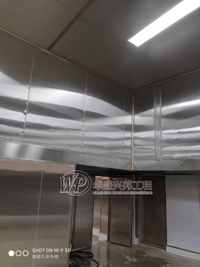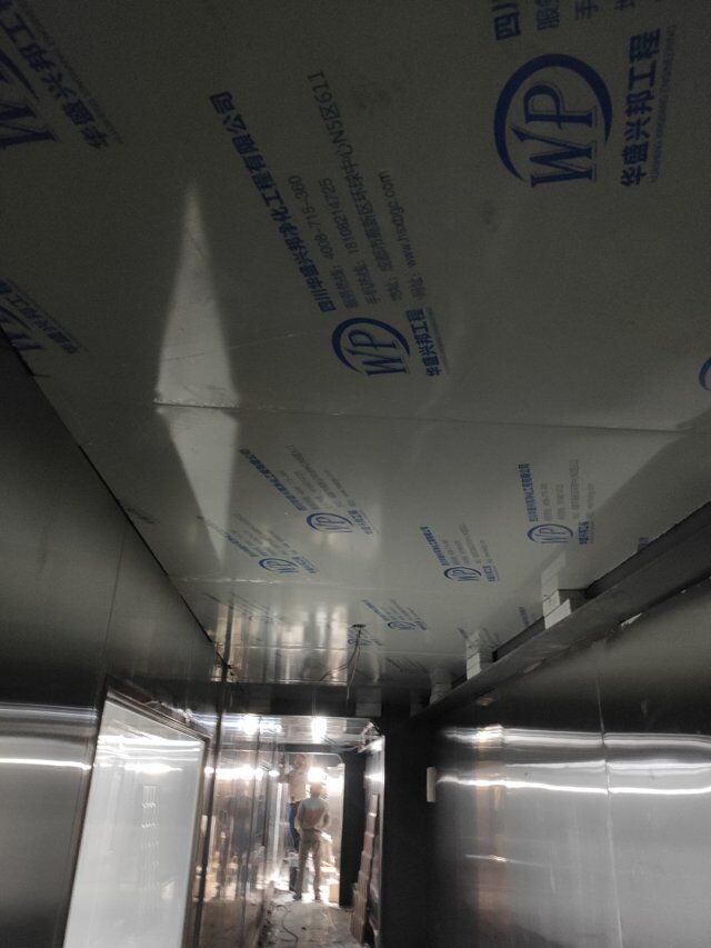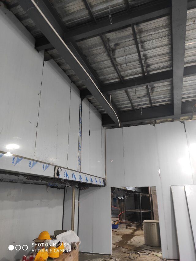 四川升鐘湖久全食品有限公司廠房裝修現場,墻板立完,風口開孔