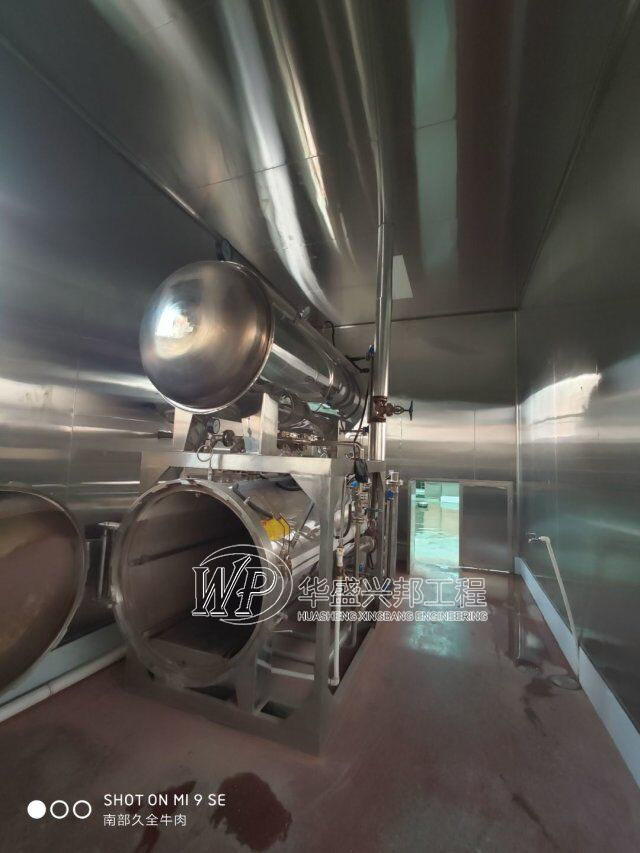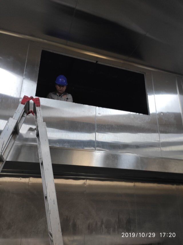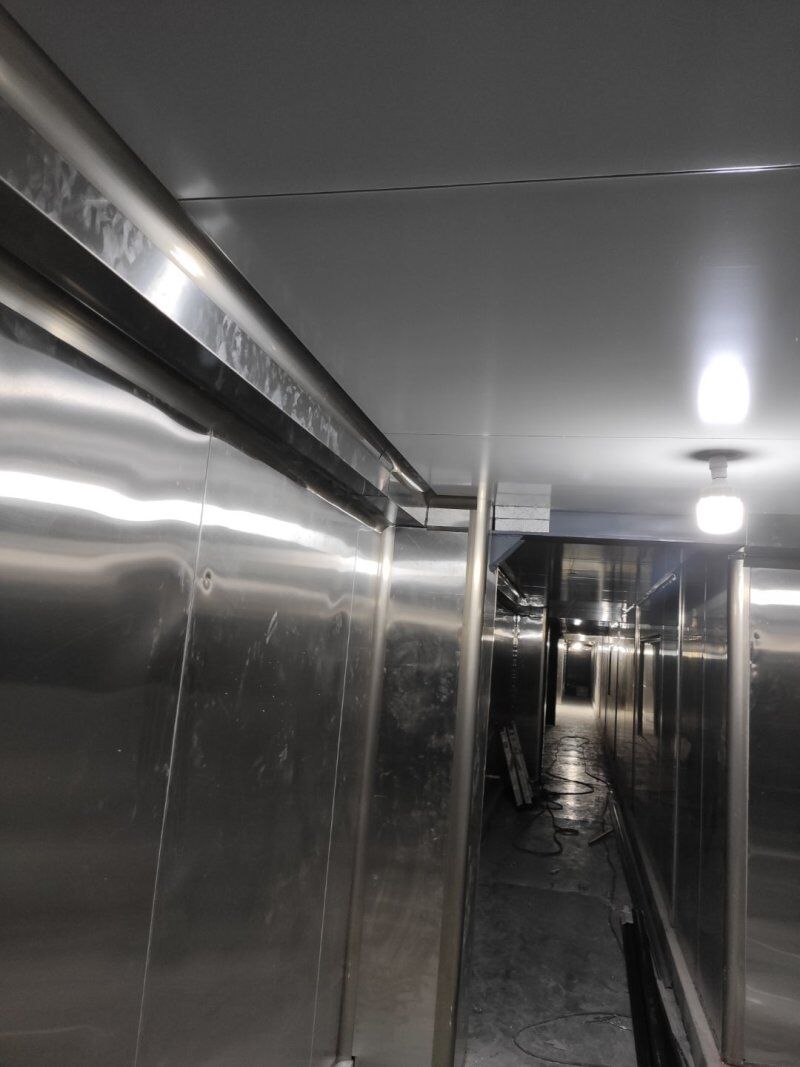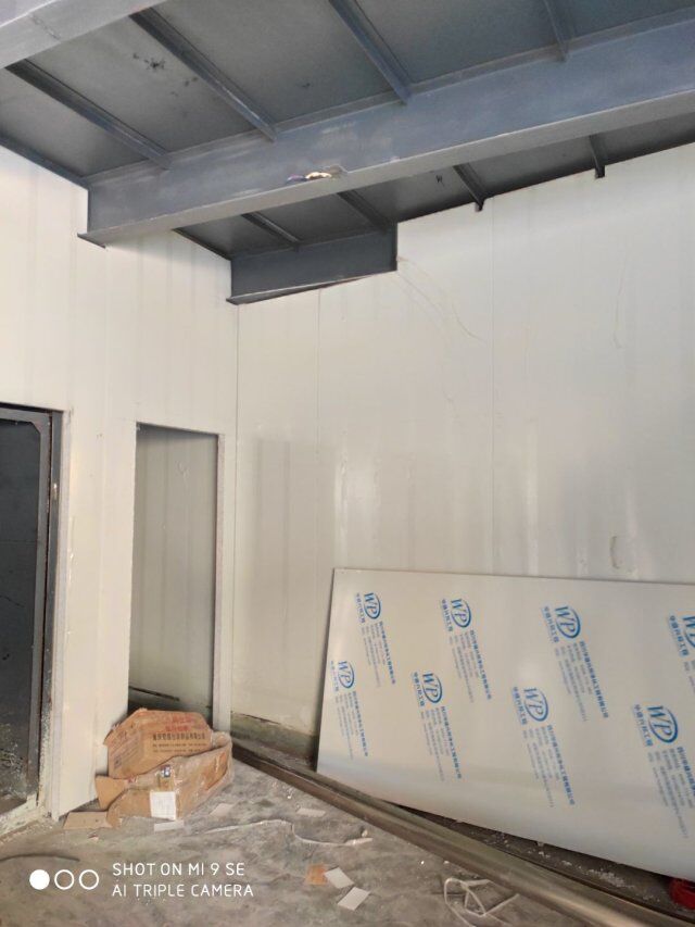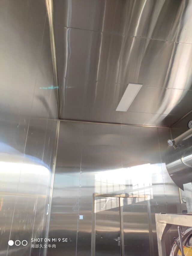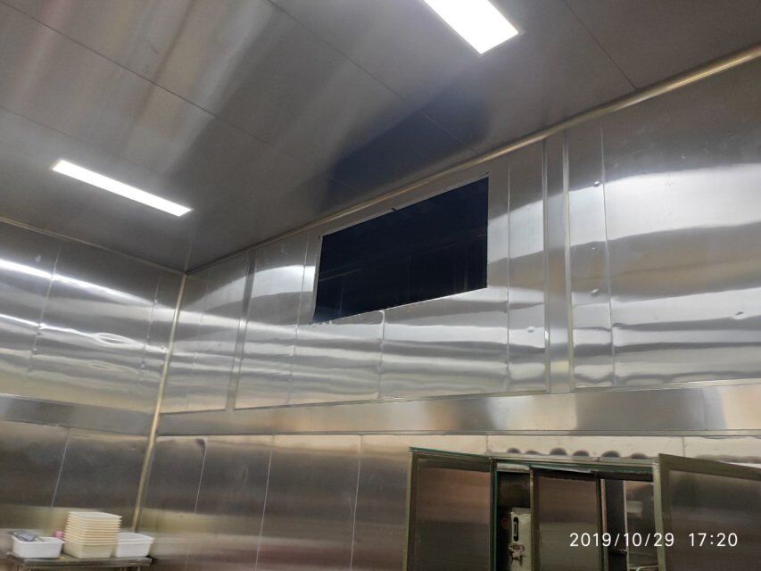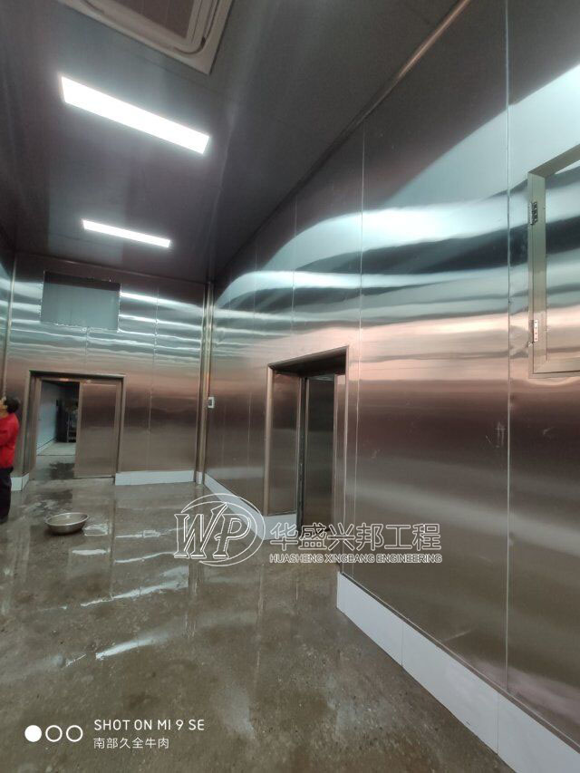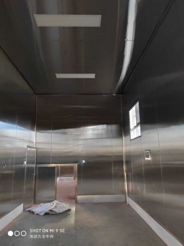 四川升鐘湖久全食品有限公司廠房裝修現場,墻板立完,風口開孔