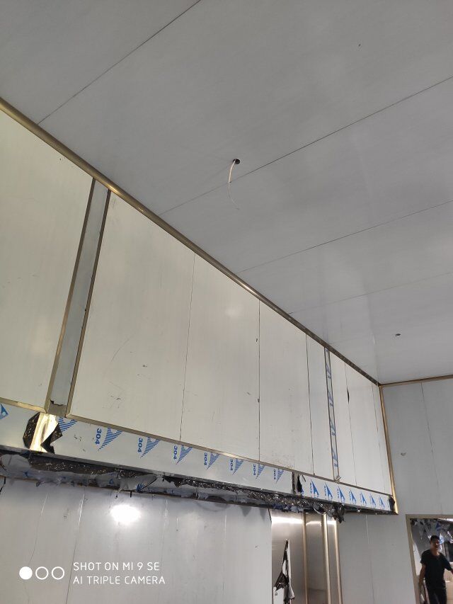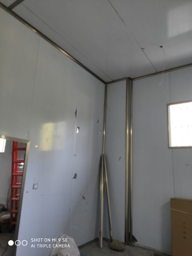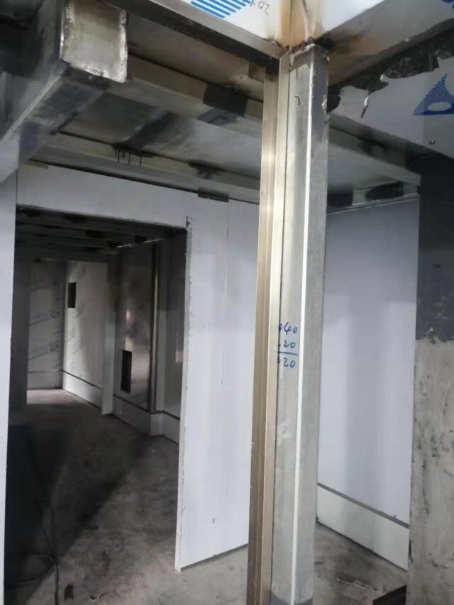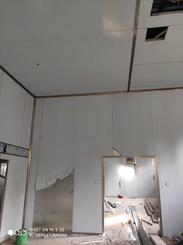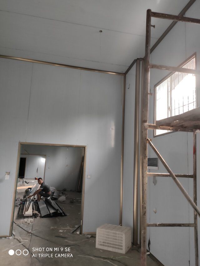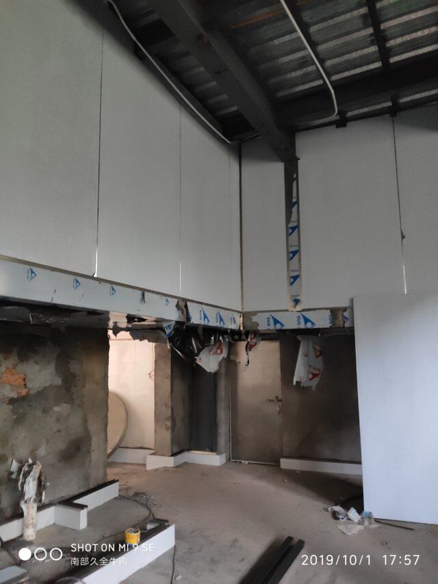 四川升鐘湖久全食品有限公司廠房裝修現場:立墻板,墻板打膠條,地槽施工中