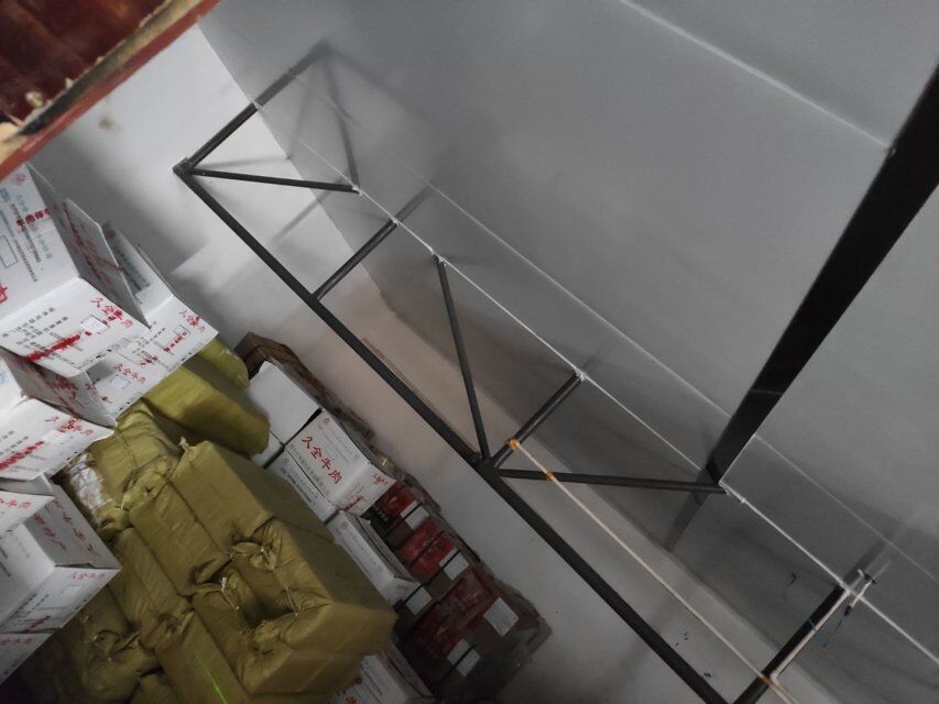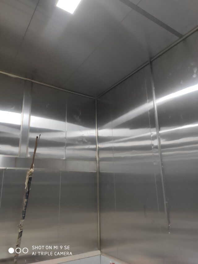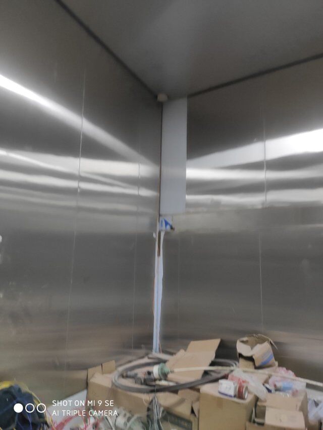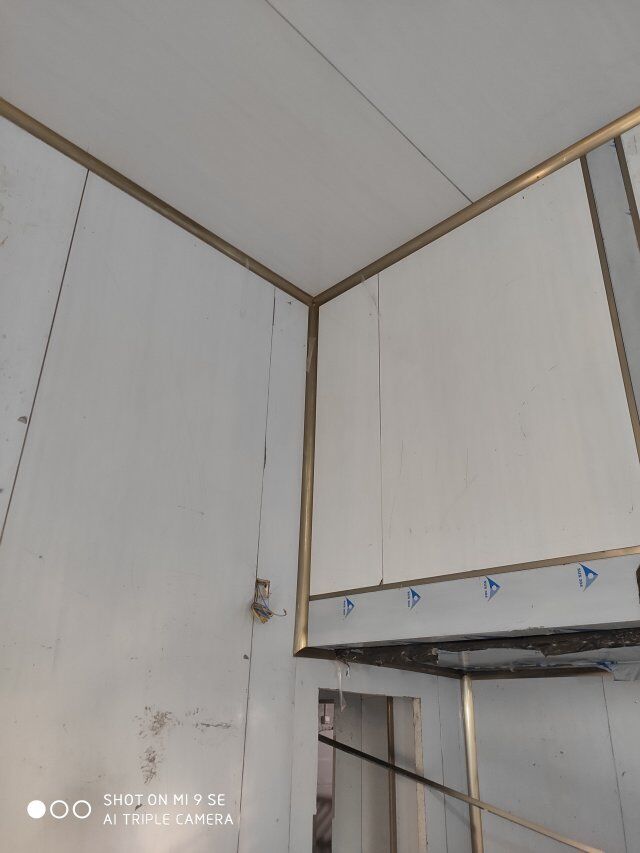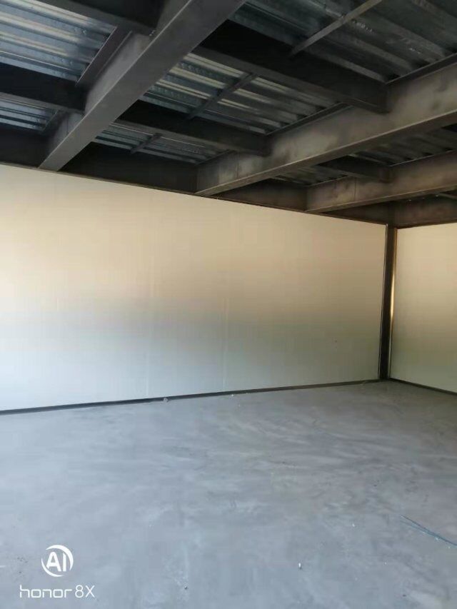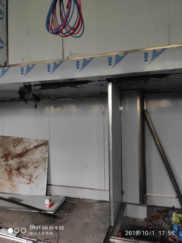 四川升鐘湖久全食品有限公司廠房裝修現場:立墻板,墻板打膠條,地槽施工中