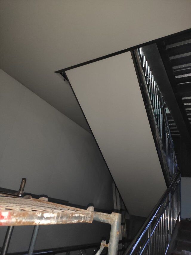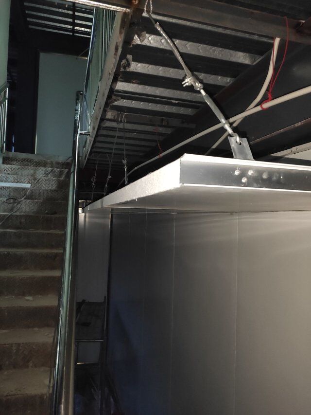 打角鋁完成50% 鋼平臺吊頂開始 搬板子到二樓