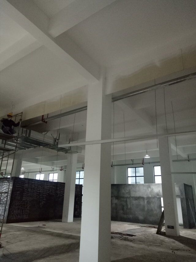 1、加工車間及風機房聚氨酯超耐磨底漆施工完成, 2、辦公區域木地板安裝完成, 3、車間燈安裝完成, 4、門安裝完成