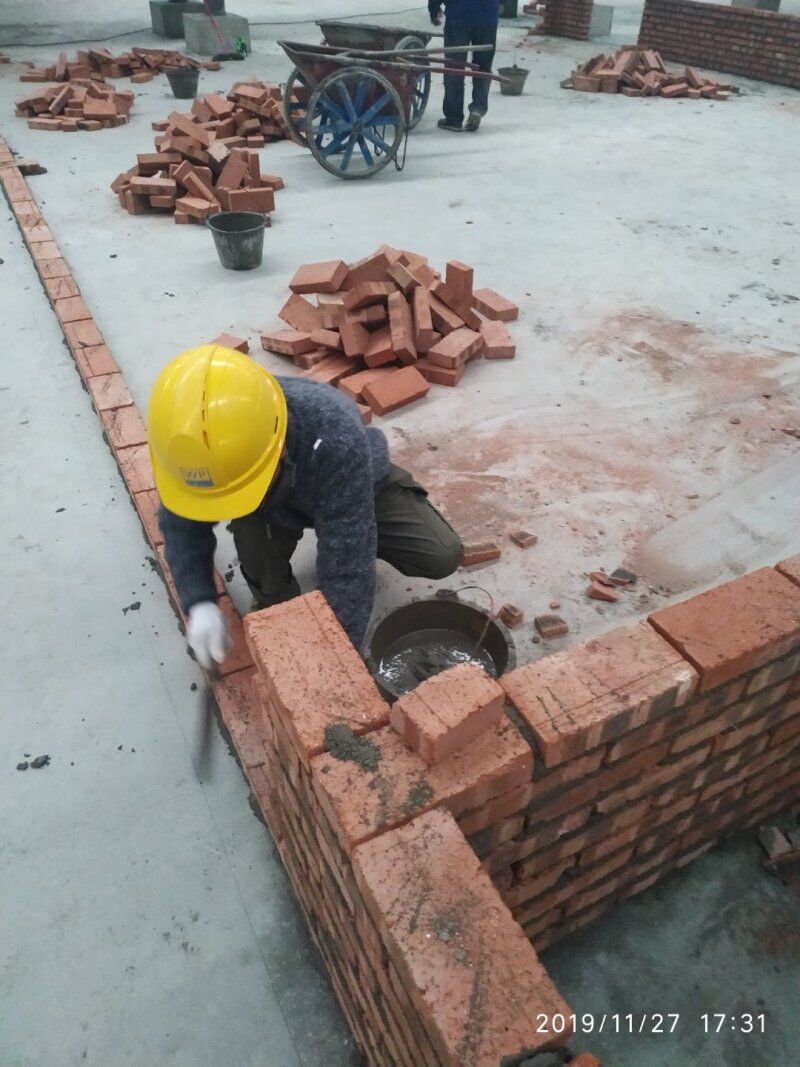 過渡車間砌磚施工,擋水墻砌磚施工,擋水墻抹灰,防水施工開始,建渣裝袋清運完成。