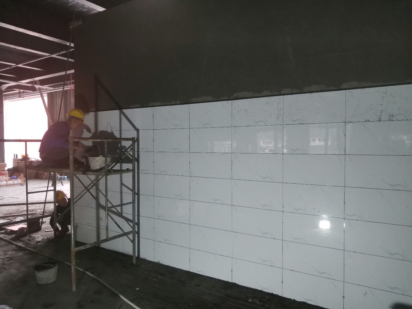 1,衛(wèi)生間外墻貼磚完成75%, 2,二樓擋水墻斜磚收尾,磚縫勾縫完成70%, 3,二樓凈化頂板完成,圓弧打膠完成30%, 4,彩鋼門預(yù)制安裝完成20%。