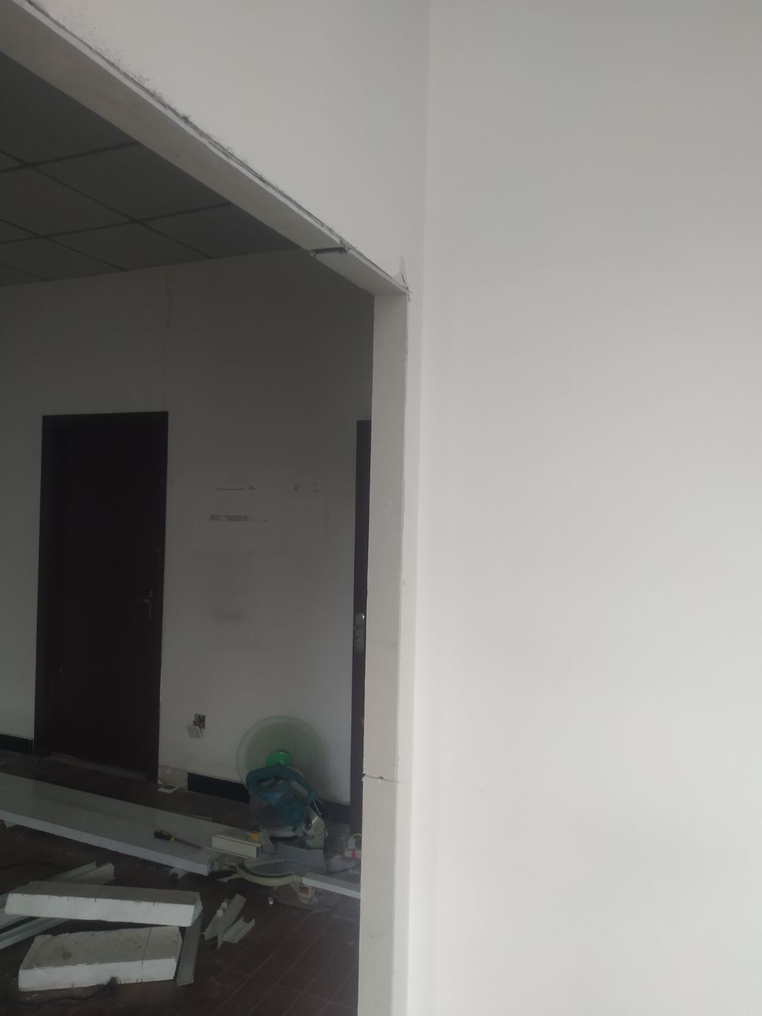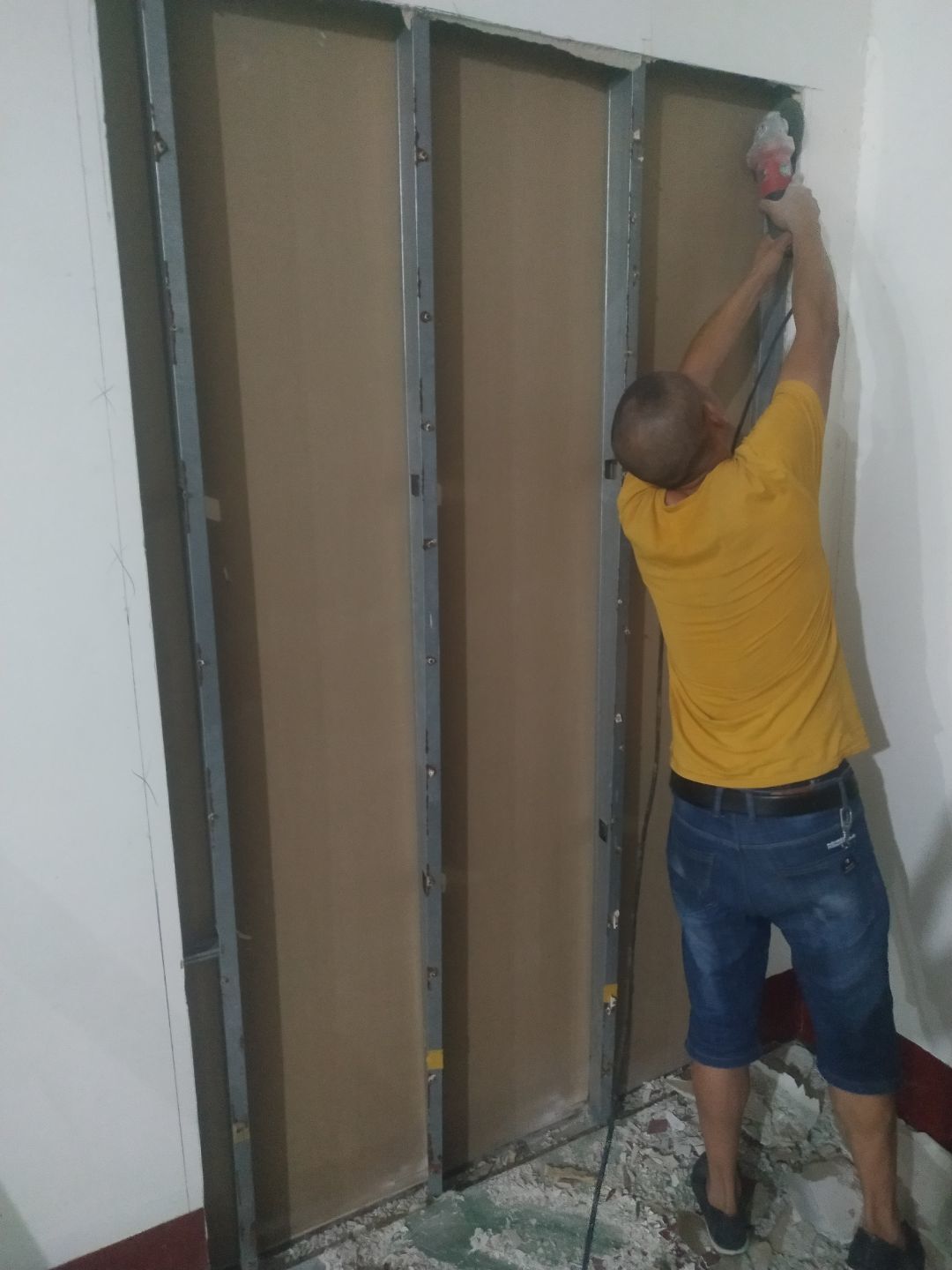 1.增項墻體拆除完成,窗簾盒安裝完成。2.彩鋼立板安裝,門框料預制完成,門框安裝完成50%,撕膜完成,打膠完成25%,塑料底座安裝完成40%,圓弧安裝完成20%。