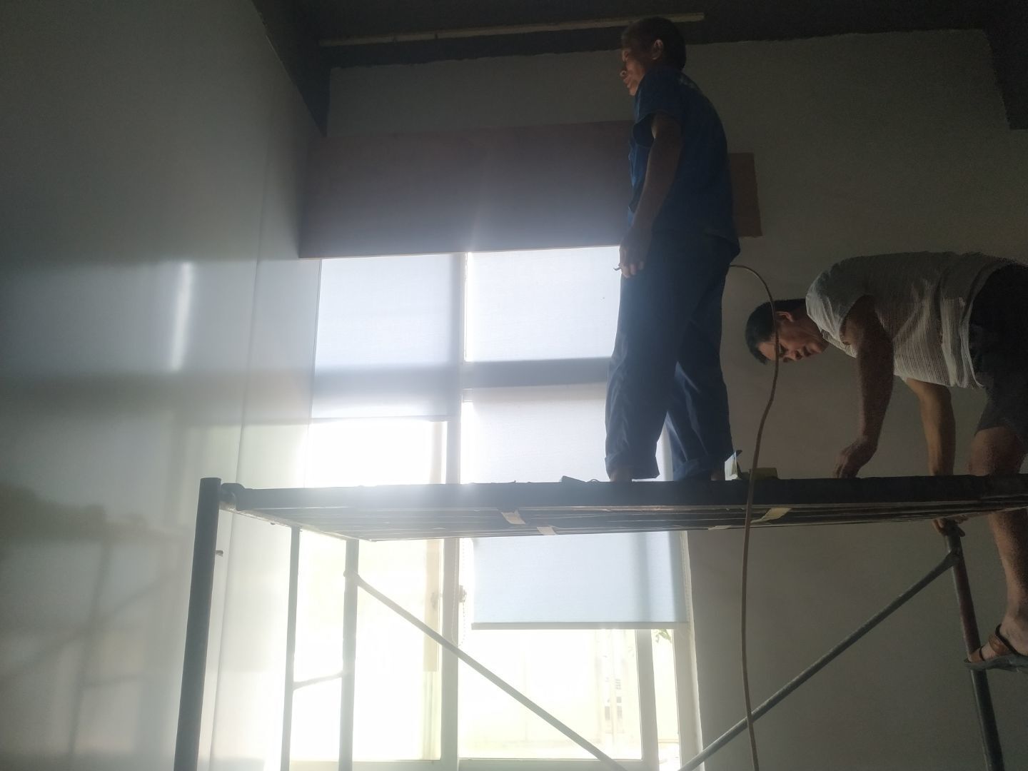 1.門安裝完成,擋鼠板安裝完成,彩鋼收尾結束。2.照明燈換氣扇安裝完成95%,紫外線燈安裝完成,插座安裝完成。