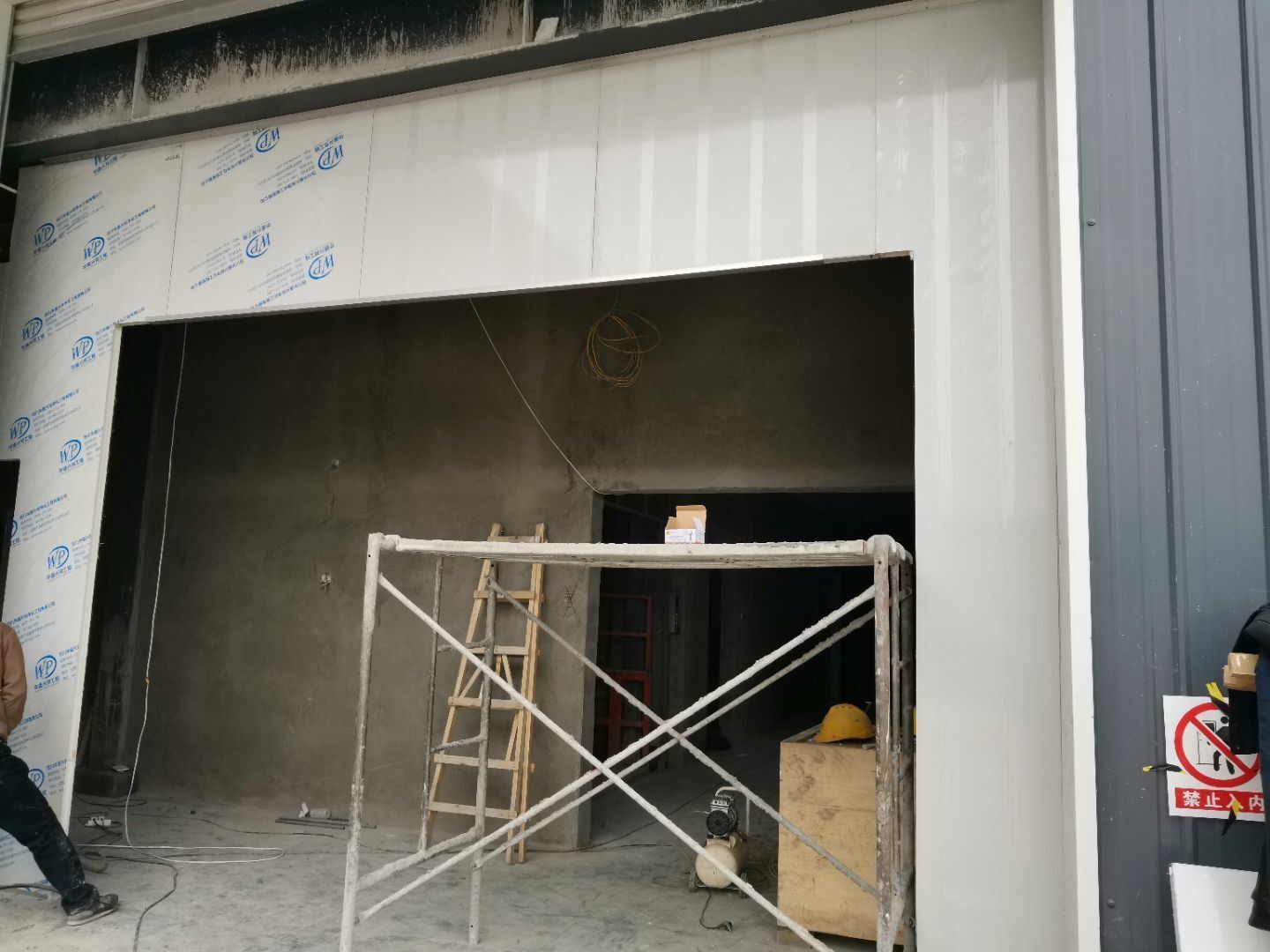 1,防火門安裝完成, 2,一樓彩鋼墻板完成90%,增項(xiàng)除外, 3,一樓衛(wèi)生間貼磚完成50%, 4,水電安裝完成70%。