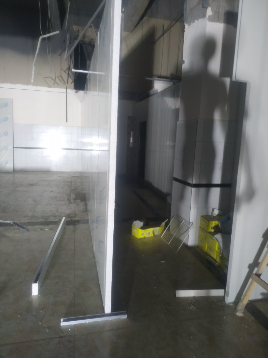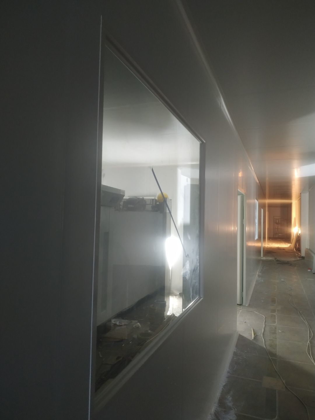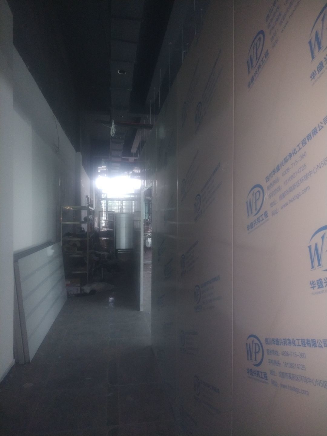 撕膜打膠完成95%,圓弧安裝完成90%,門安裝完成85%,觀察窗安裝完成,燈具安裝完成80%,配管穿線完成60%。