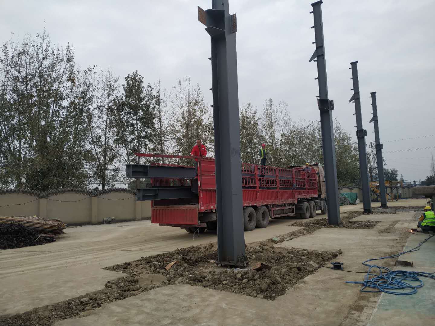 1.鋼構材料進場30%。2.鋼柱安裝完成20%。