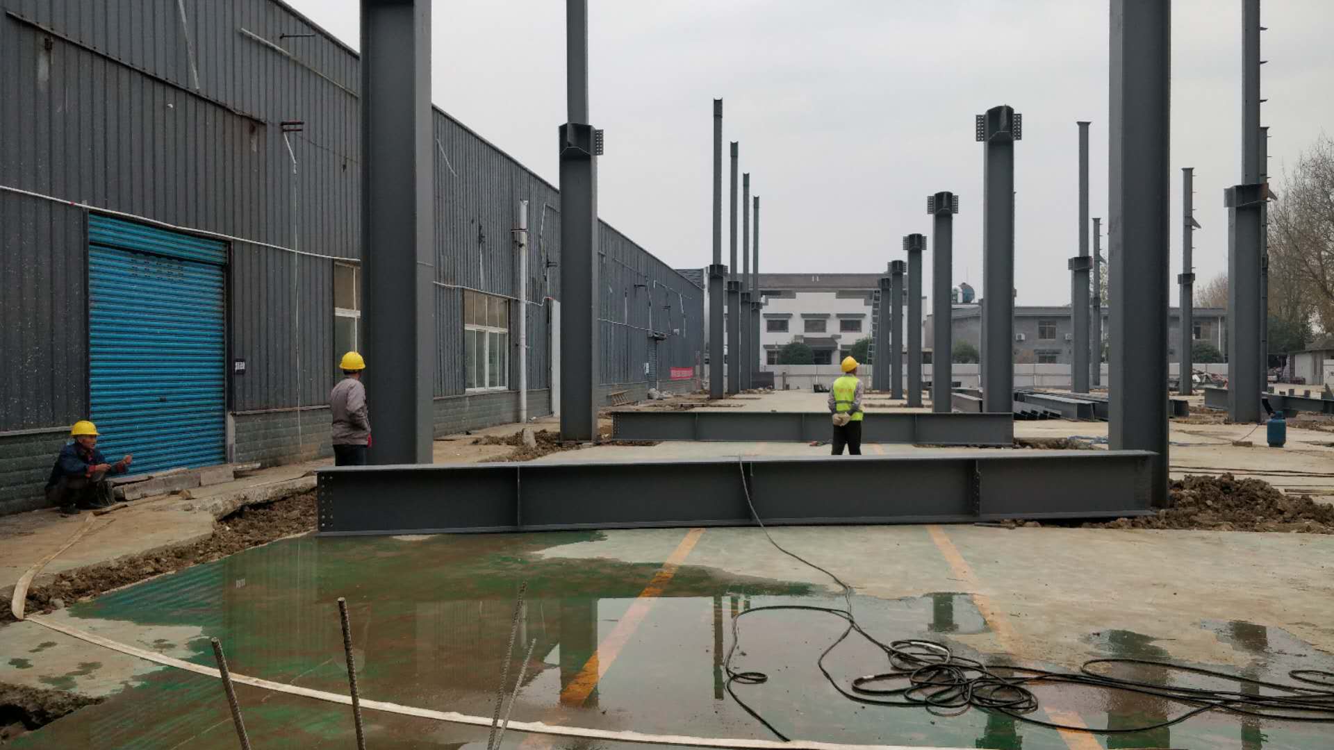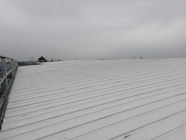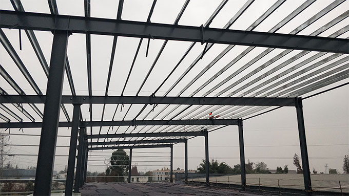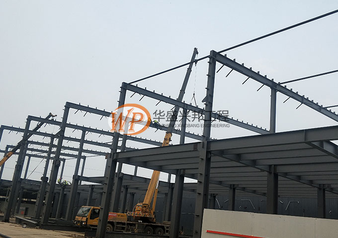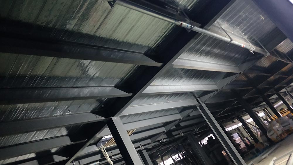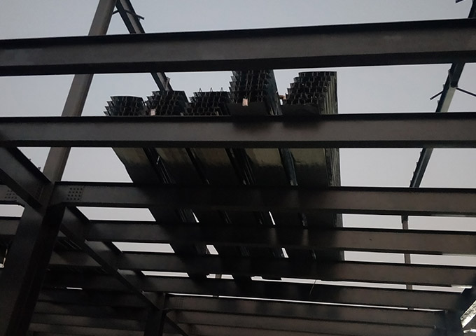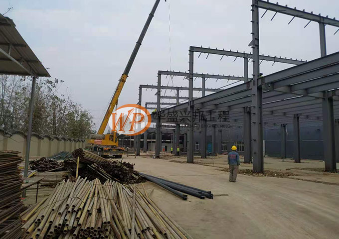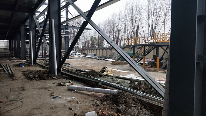 1.設備基礎完成100%;2.落水管預埋完成100%;3.屋面夾層完成30%;4.屋面檁條安裝完成100%;5.地坪鋼筋安裝完成100%;6.低洼處鋪石子完成