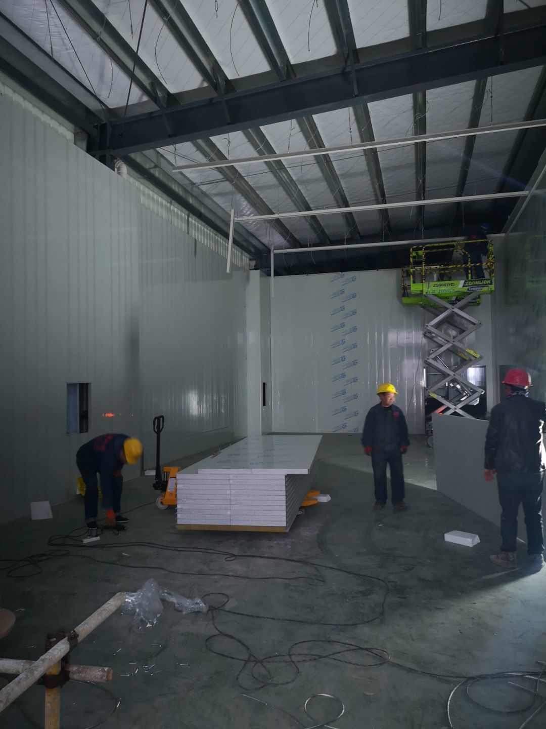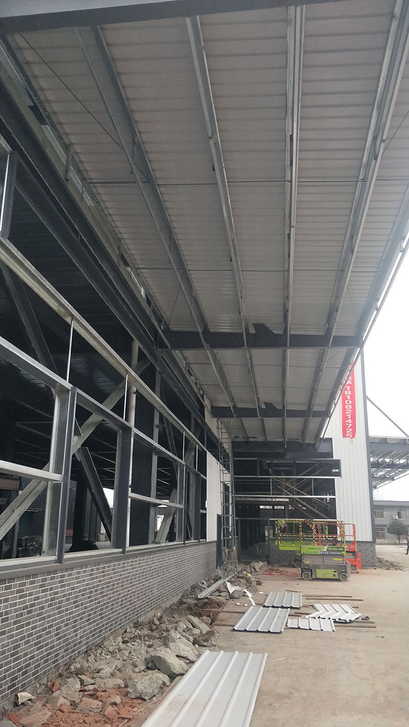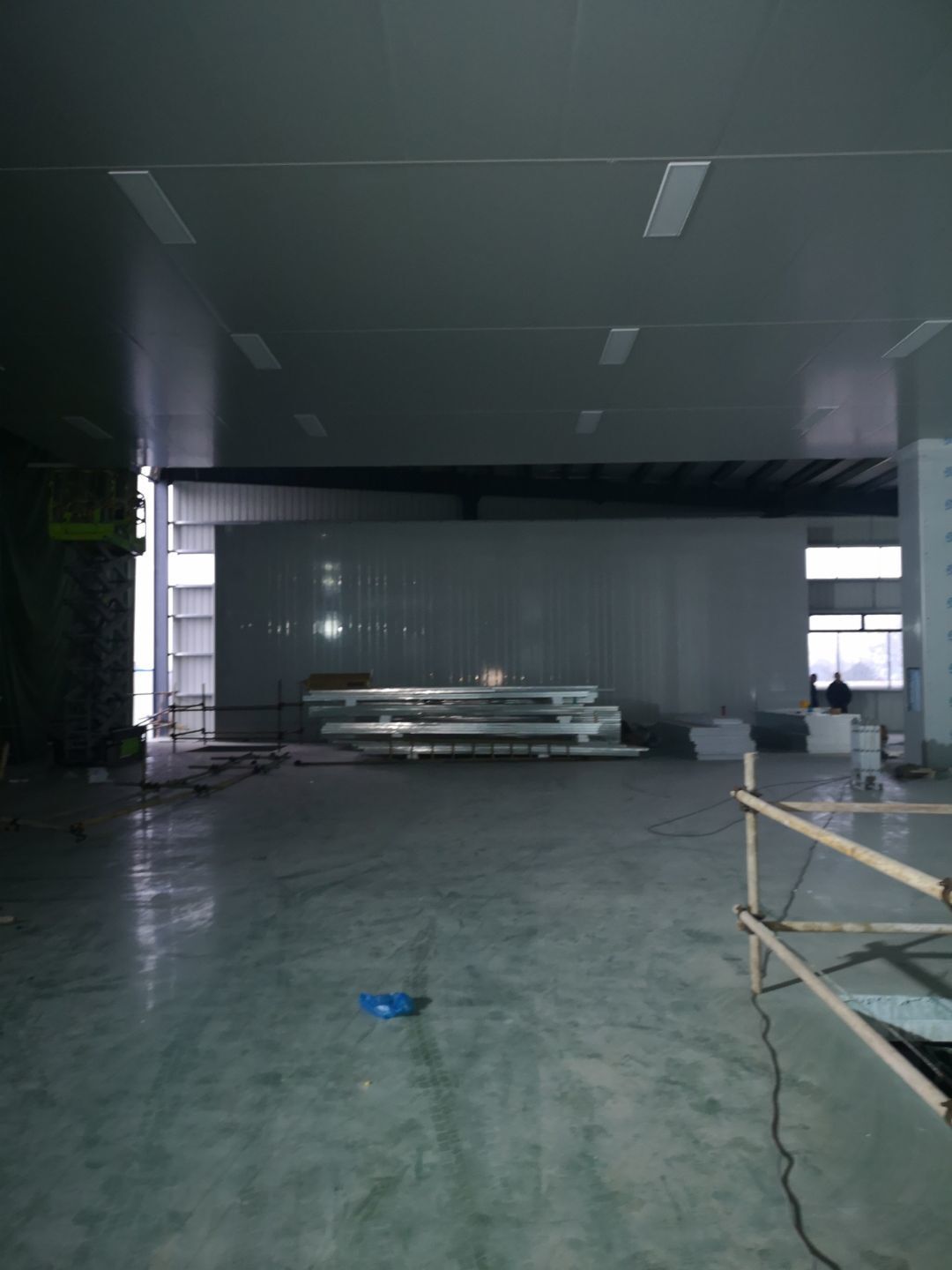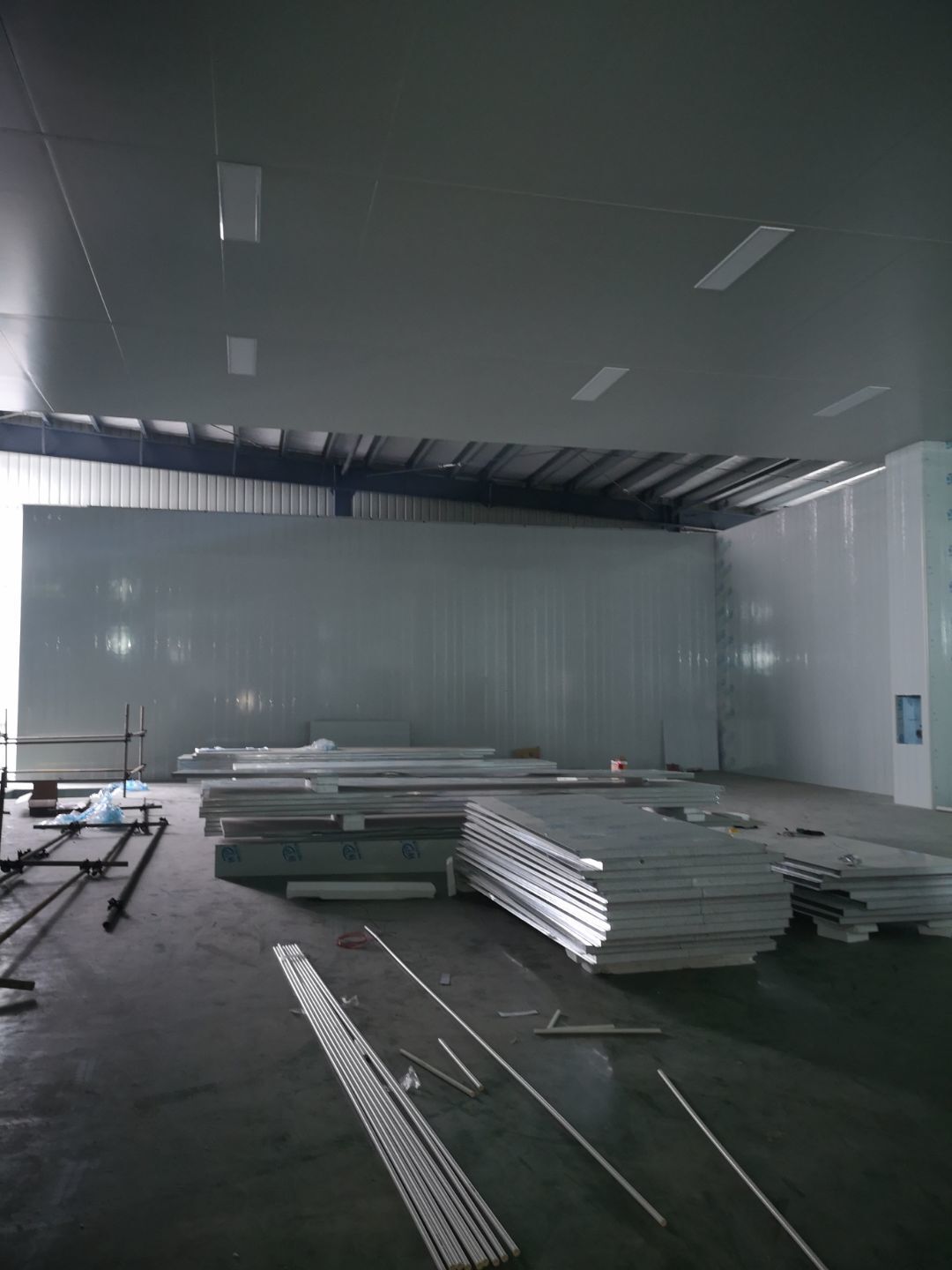 廠房外觀裝玻璃,內裝彩鋼板到現場,隔斷開始施工