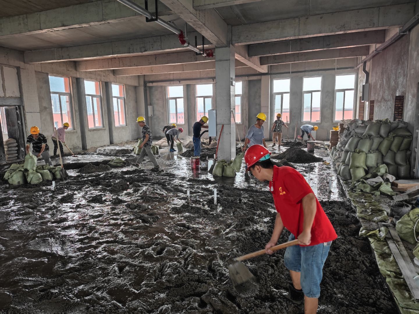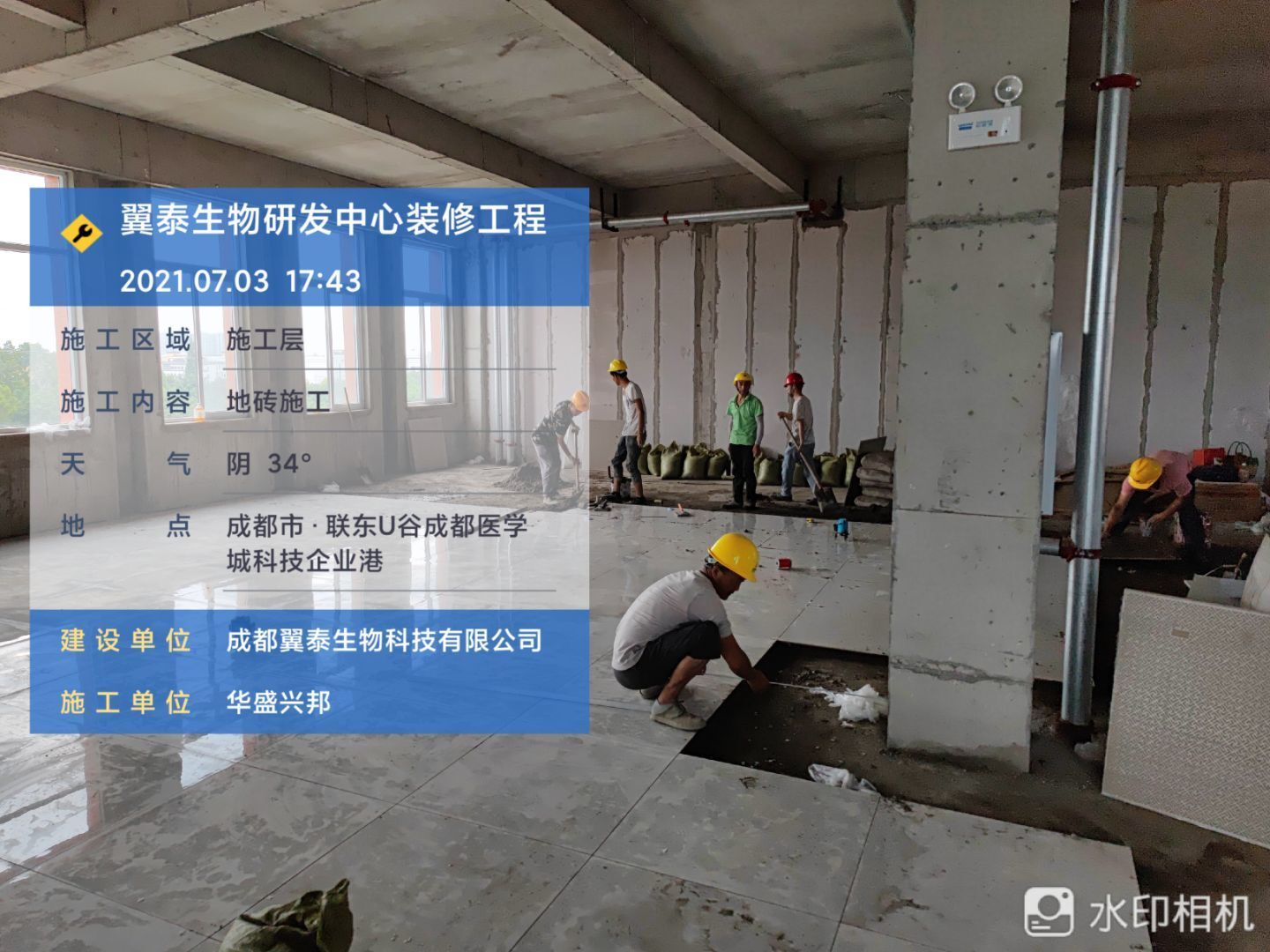 1.地磚施工人員,完成面積約30平; 2.砌體抹灰施工,衛生間包排水管 抹灰完成1/3