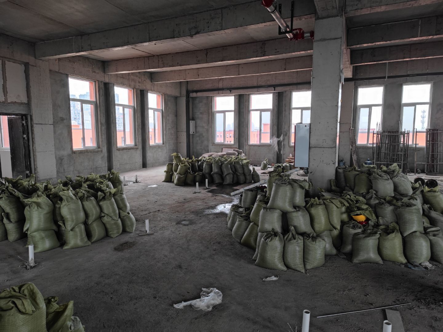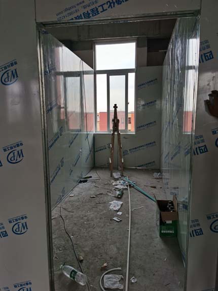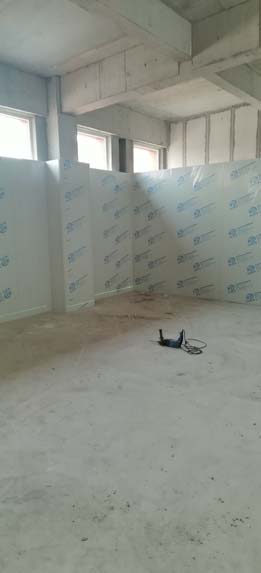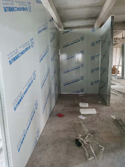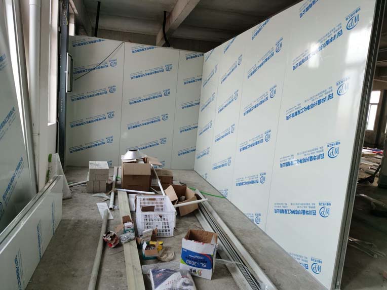 ①彩鋼墻板立板完成40% ②衛生間土建施工完成80% ③ 凍庫制作安裝完成80%