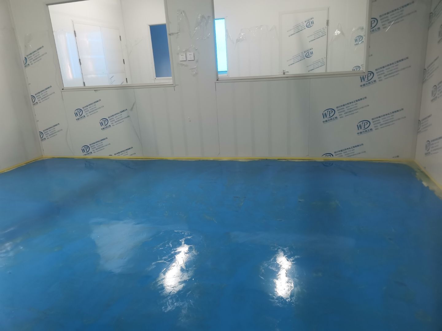1.頂板安裝完成100%; 2.三防板吊頂完成100%; 3.水電安裝完成100%,燈具安裝完成100%; 4.新增動力電完成100%; 5.衛生間隔墻完成100%; 6.腳踏池完成100%; 7.風淋室制作完成100%; 8.地坪膩子層完成100%; 9.板縫及地面縫隙處理完成70%; 10.場地清理。