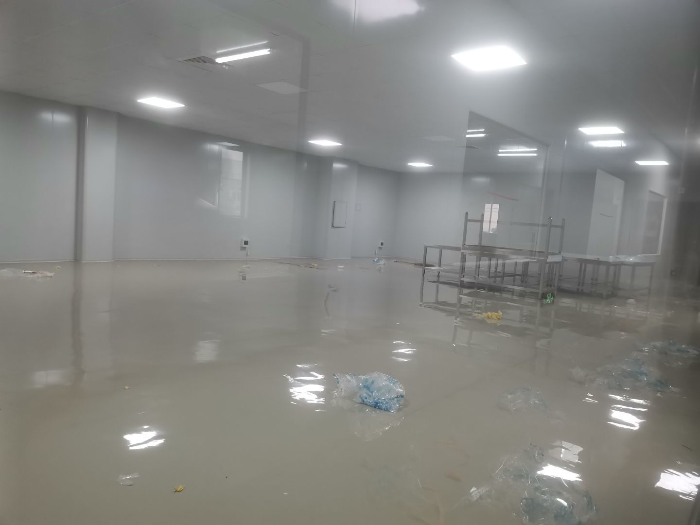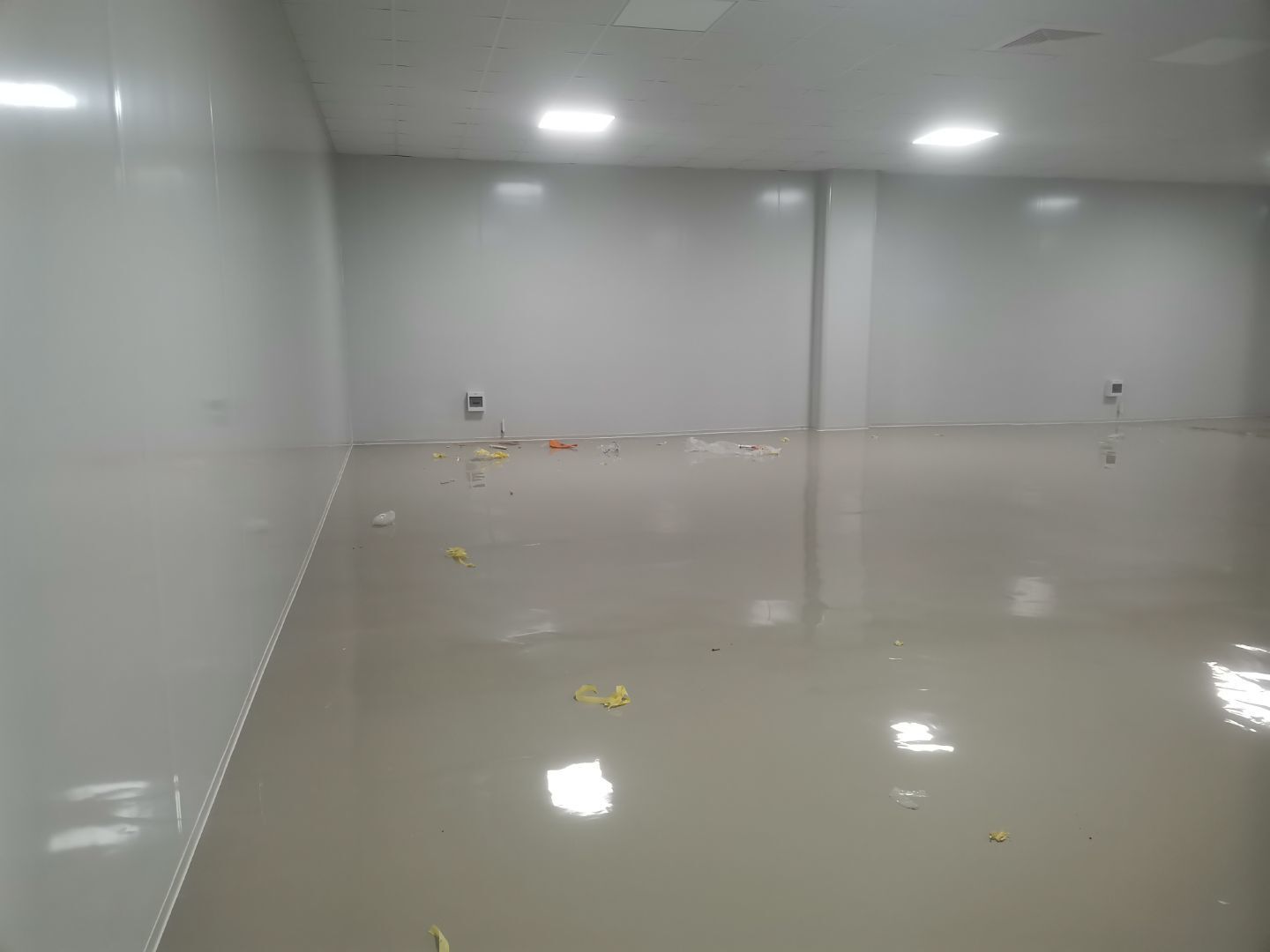 1.頂板安裝完成100%; 2.三防板吊頂完成100%; 3.水電安裝完成90%,燈具安裝完成95%; 4.新增動力電完成90%; 5.衛生間隔墻完成100%; 6.腳踏池完成100%; 7.風淋室制作完成90%; 8.地坪膩子層完成80%; 9.場地清理。