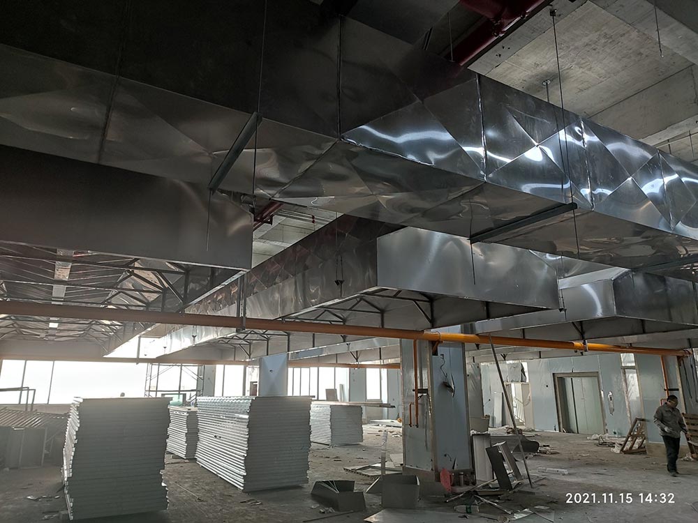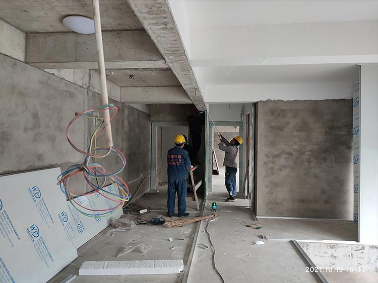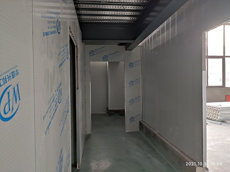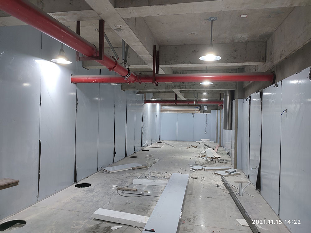 工程進度: 1,一樓鋼平臺彩鋼隔墻完成50% 2,二樓更衣區過道頂板完成 3,3樓頂板吊桿安裝完成80% 4,電工進場,點位繪制并跟甲方確認完成3,4樓