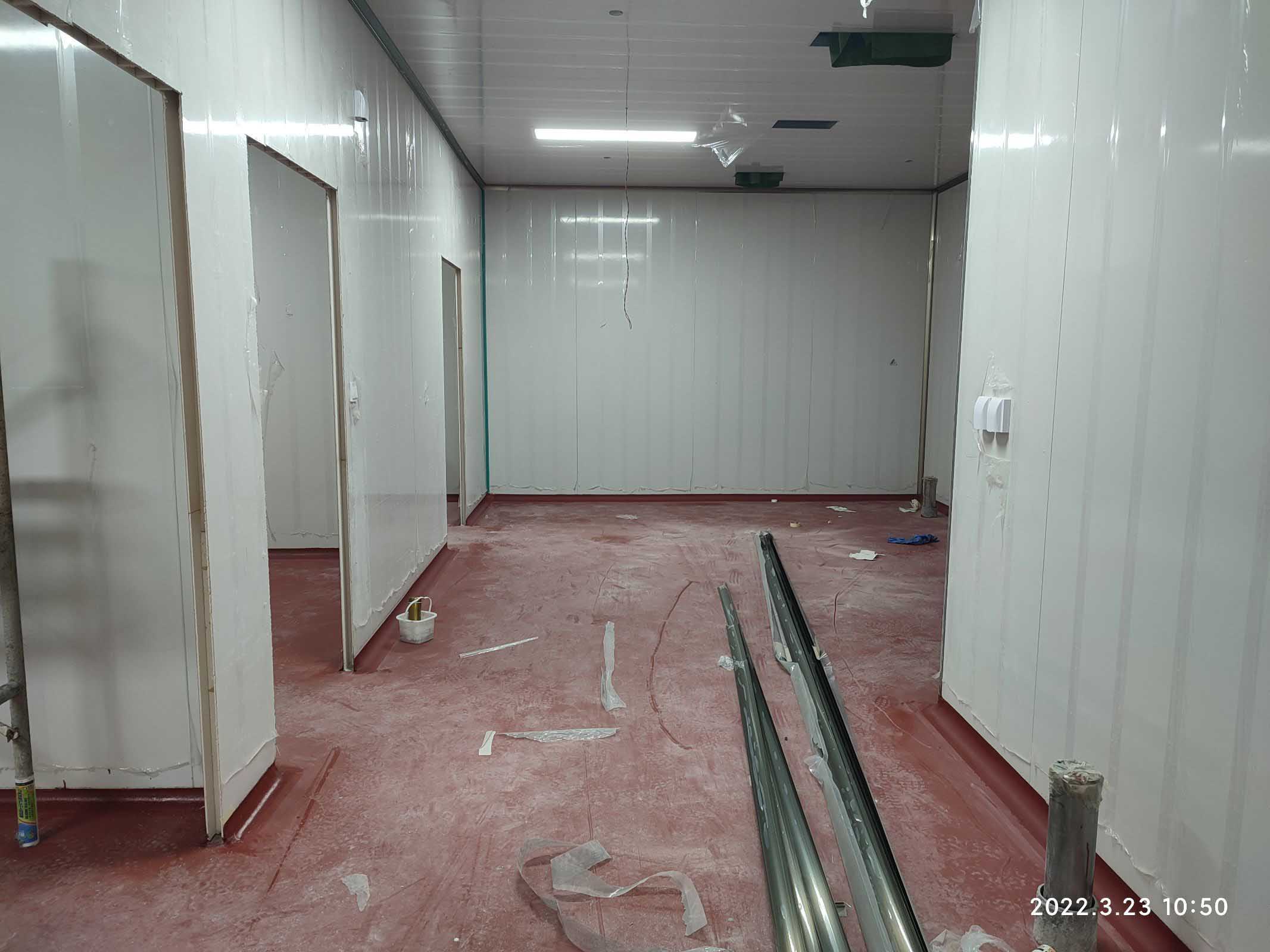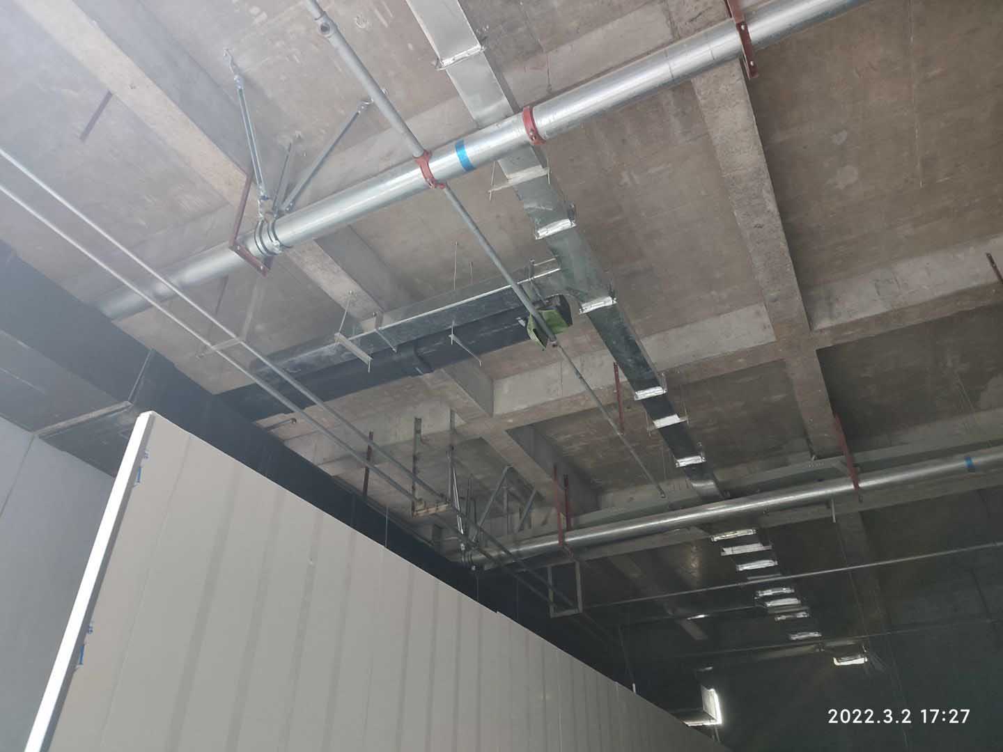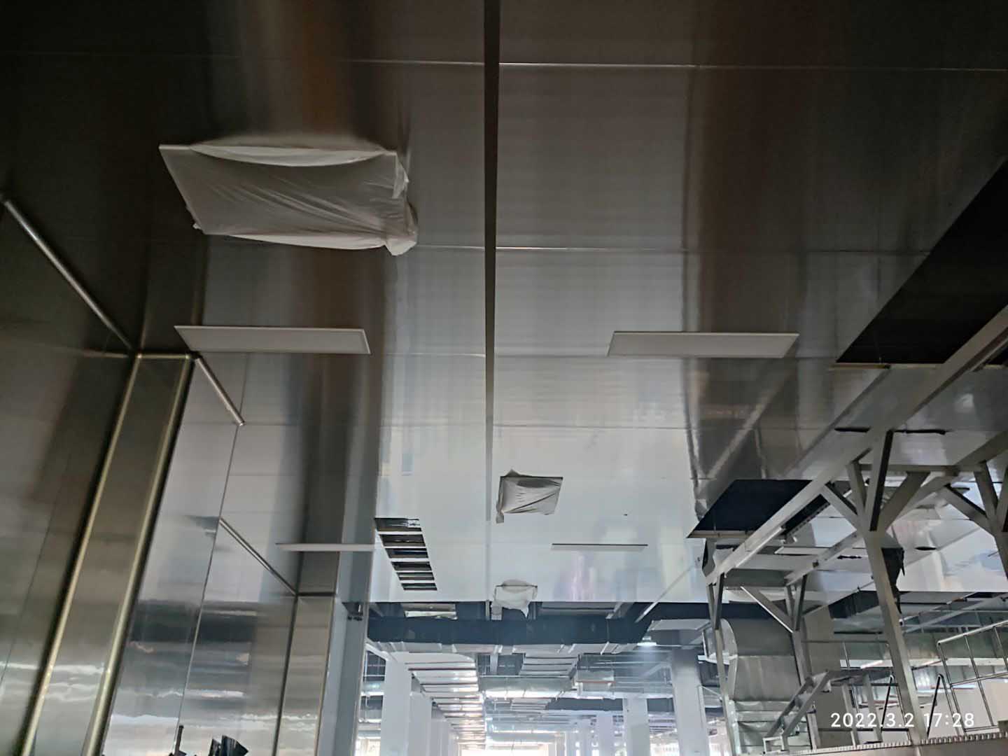 1,彩鋼板吊頂完成85% 2,組空配管完成30% 3,照明插座布線完成65%,燈具安裝完成40% 4,高效和回風(fēng)末端風(fēng)管尺寸量取完成。