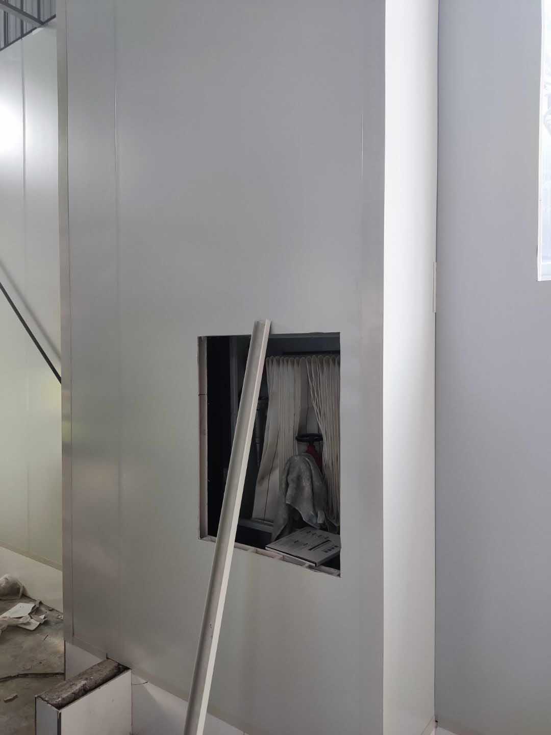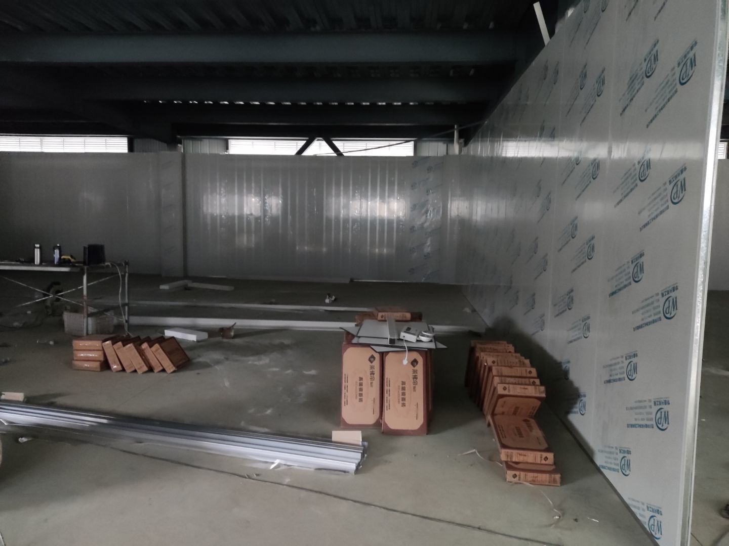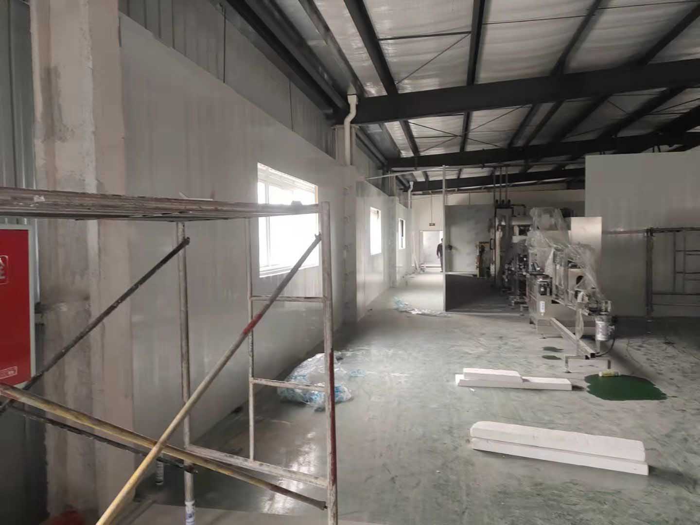 一樓廁所地磚安裝完成50%,一樓辦公室地磚安裝完成20%;一樓生產區域墻板安裝完成65%,二樓吊裝口窗戶拆除完成。