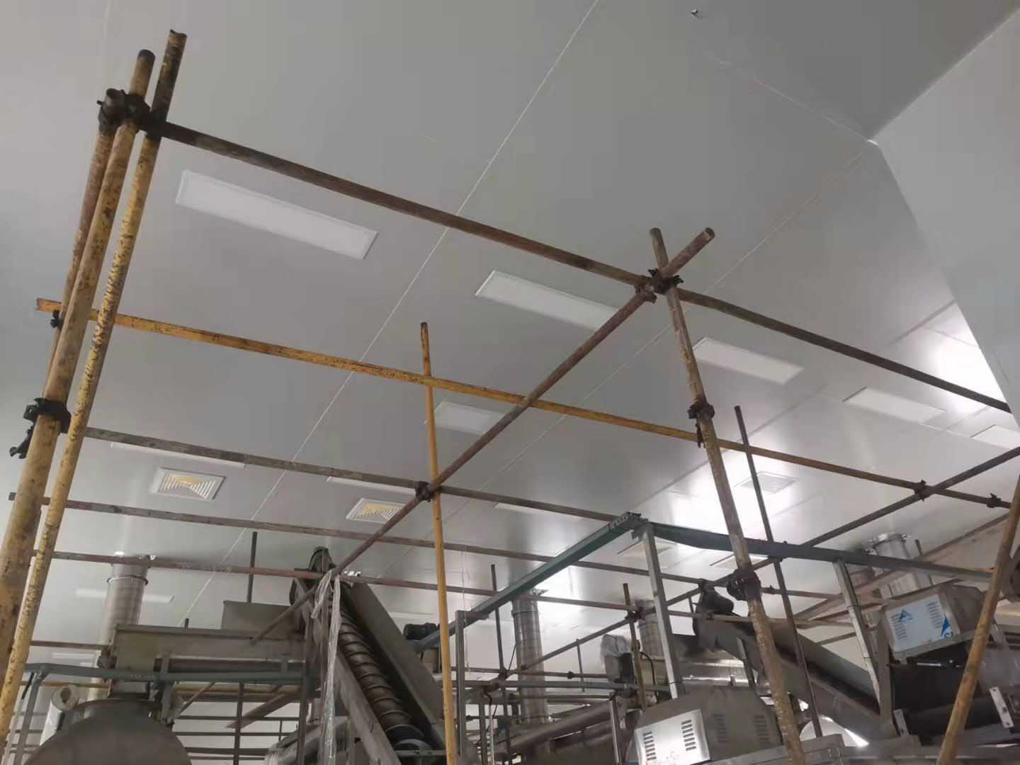 二樓車間凈化板吊頂完成,圓弧安裝完成約10%;一樓車間內三防板吊頂完成,一樓車間圓弧安裝完成約80%;單層廠房擋水墻砌磚完成約80%。