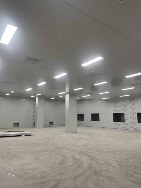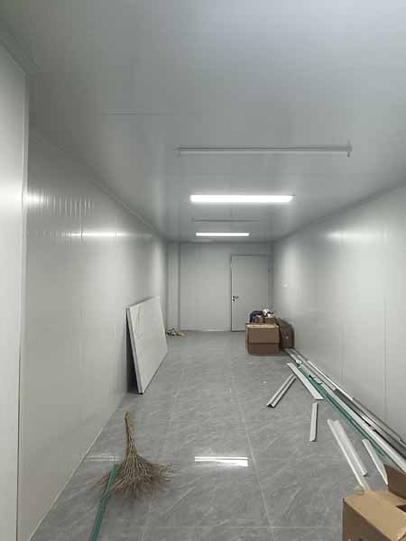 1、凍庫控制電柜線路配線安裝98%,線路檢測。 2、凍庫設備管道清灰、自檢。 3、裝修收尾完成。 4、自由門邊擋水墻收尾完成 5、衛生打掃